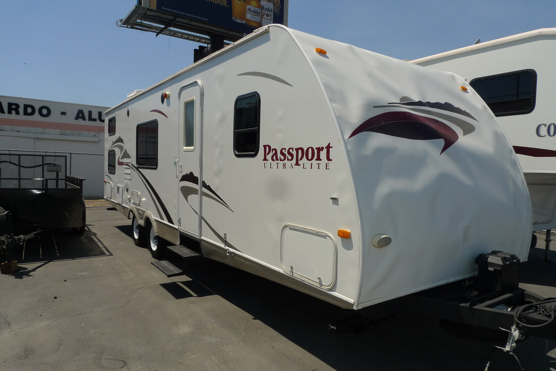 Leaks delaminations will seal no repair single slide bunkhouse passport travel trailer w rear bath including lavatory tub shower toilet rear double bed w bunk above wardrobe shelf refrigerator 3 burner range dbl.